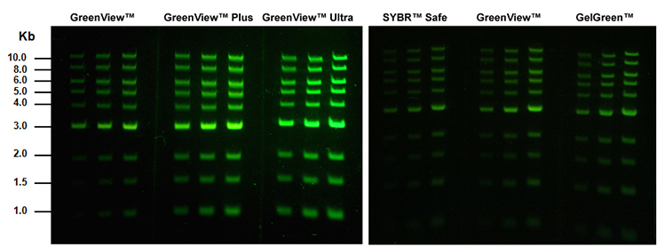 Figure 1. Gel stain results with GreenView™, GreenView™ Plus, and GreenView™ Ultra (Left), and comparison results with SYBR Safe™ and GelGreen™ (Right). Two-fold serial dilutions of a 1 kb DNA ladder (NEB, Cat # N0468S) were loaded onto each gel in 3 lanes in the amounts of 25 ng, 50 ng and 100 ng (left to right), then post-stained with GreenView™, GreenView™ Plus, GreenView™ Ultra, SYBR Safe™ and GelGreen™, respectively. Results show GreenView™ has similar sensitivity with SYBR Safe™ and GelGreen™, GreenView™ Plus and GreenView™ Ultra have much better sensitivity.