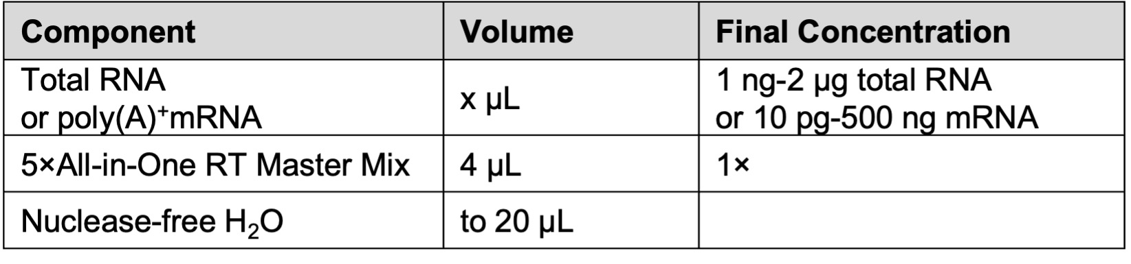 RT reactions should be assembled in a RNase-free environment. The use of clean pipettes designated for PCR and aerosol resistant barrier tips are recommended.