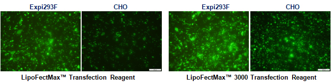 Figure 2. The transfection efficiencies of LipoFectMax™ and LipoFectMax™ 3000 in Expi293F, and CHO suspension cells both are over 95%, ideal for protein expression.